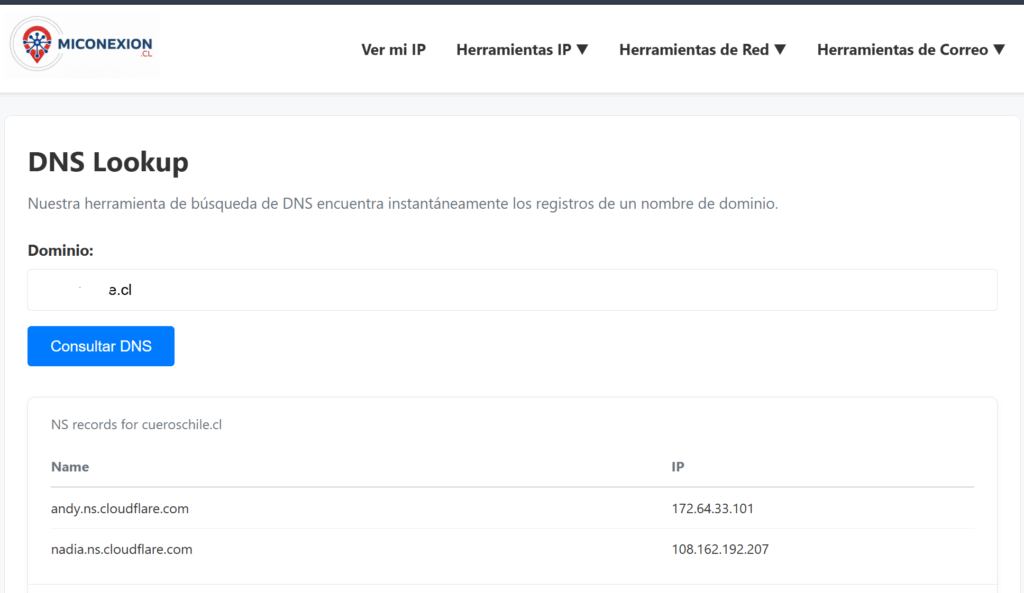 - Ingresa a nuestra herramienta de consulta: https://miconexion.cl/dns-lookup.php
