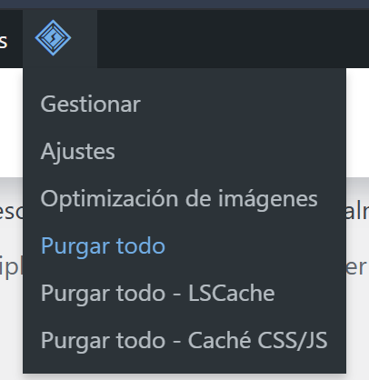 • Busca el ícono del diamante de LiteSpeed en la barra superior negra de tu WordPress.