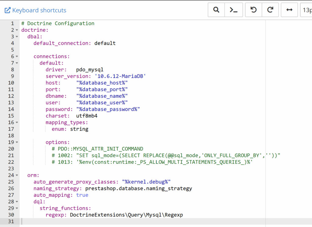 app/config/), busque el archivodoctrine.ymly agregue la versión del servidor debajo de «driver: pdo_mysql«. - Importante: Si encuentra las líneas
